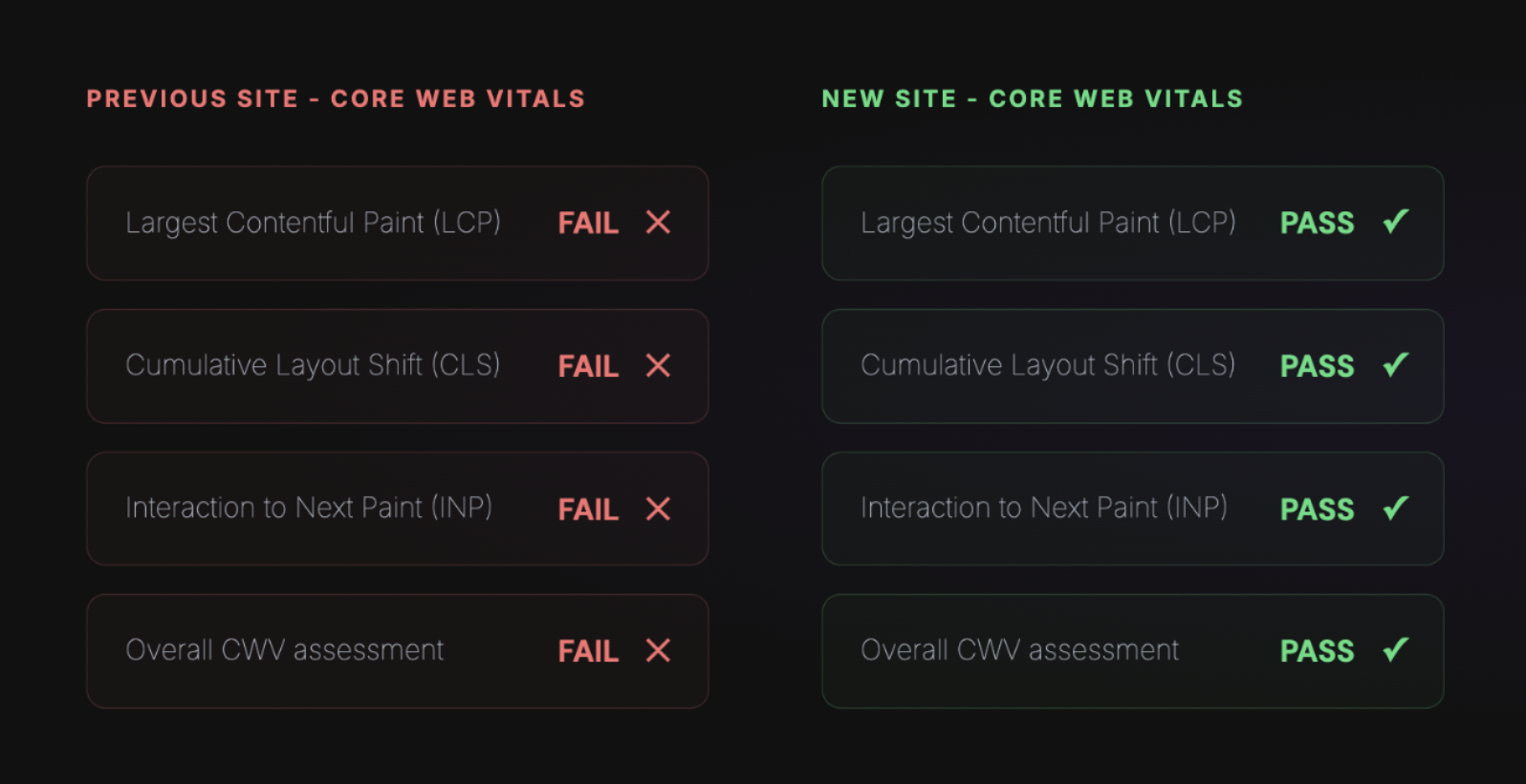 • Previous site failing Core Web Vitals - new site had to pass perfectly from day one